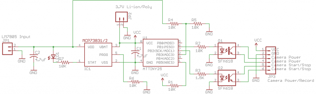 I thought about using the pin change interrupt but I don’t know how much the car charger/LM7805 would fluctuate when the car is started so I went with the watchdog timer of 4 seconds with a variable to know whether the camera is on or off. The MCU will always running from the Li-ion/Poly but since it’s sleeping 99% of the time it will only draw ~5uA from the battery. We just hold the power button down for 2 seconds and then hold down the recording button down for 10 seconds. When powering off, we press the record button and then hold down the power button down for 5 seconds to switch it off. Download ATtiny25_CPRC.