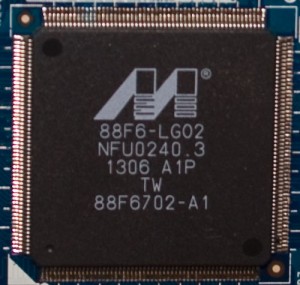 The main chip which has an ARM v5TE at 1GHz with a 16-bit DDR2-400 interface, 2 x Gigabit Ethernet, PCIe (x1), 1 x USB2.0, 2 x SATA, 2 x UART.