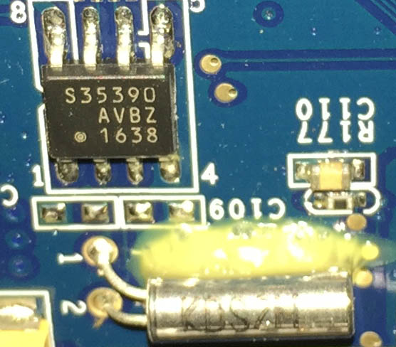 We’ve got quite a few DC-DC converters (FR9888, ZT1525) and what look to be some N/P mosfets too (AP4410GM / AP4953GM), one’s near the input jack near a diode possibly for some input protection and 2x P mosfets near a PWM driver chip (uP1504T). They’ve got a cable going to the front panel board tapped down too which just has some LEDs and a button and there’s also a SMD buzzer (AD-7504) which at first glance didn’t look like a buzzer. On the bottom board they have the RTC crystal glued down and have 7 little EMI pads touching the metal case.