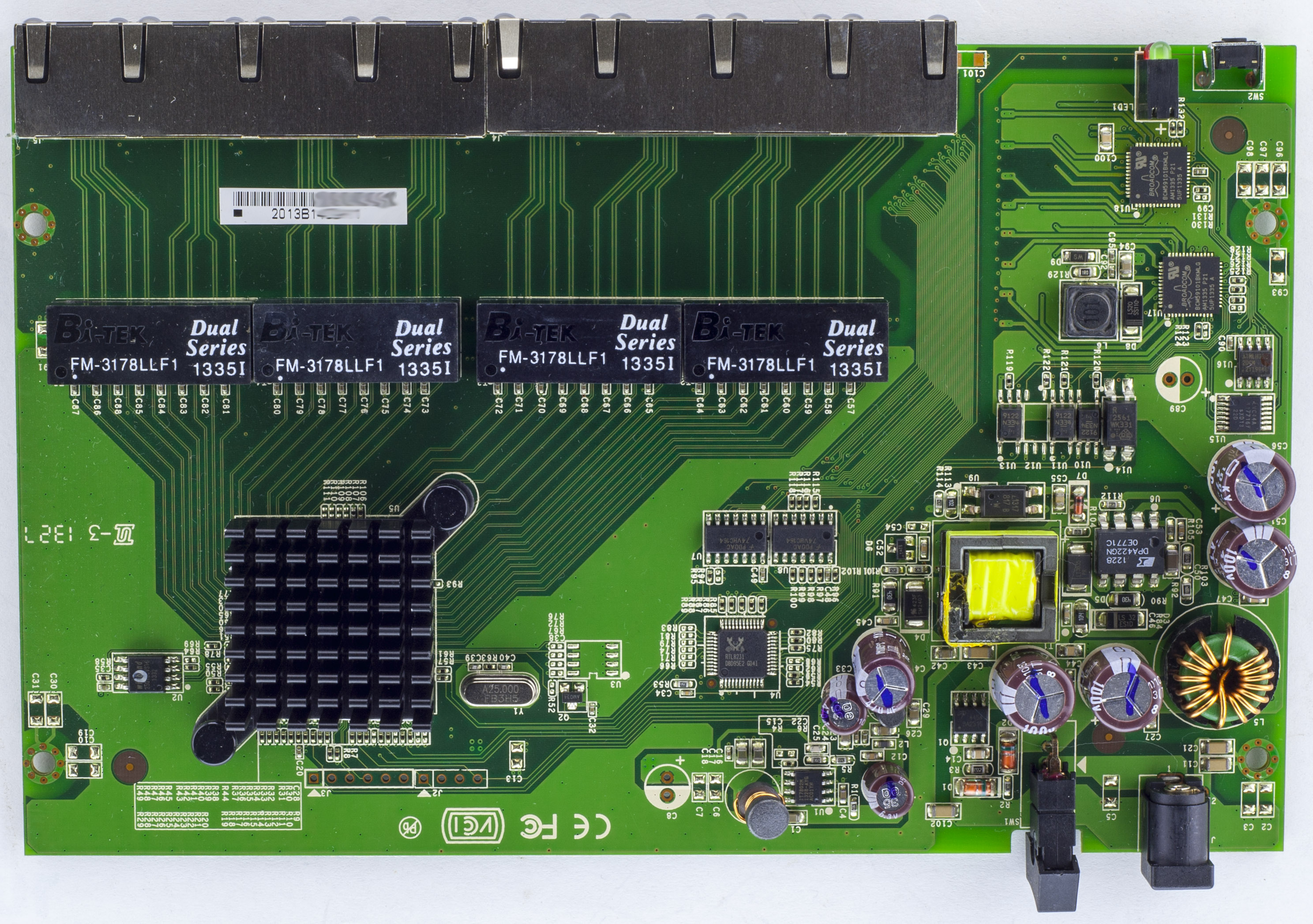 We have a single chip solution with a large heatsink and the RF side has the usual RF shield. They have exposed ground strips on 3 out of the 4 sides of the board and there are no electrolytic caps to be found, they even had a footprint for one to the left but had the option of SMD caps too. Interestingly there are 2x 4 pin headers, labelly nicely, one reads UART0 (BBS) and the other UART1 (LINUX).