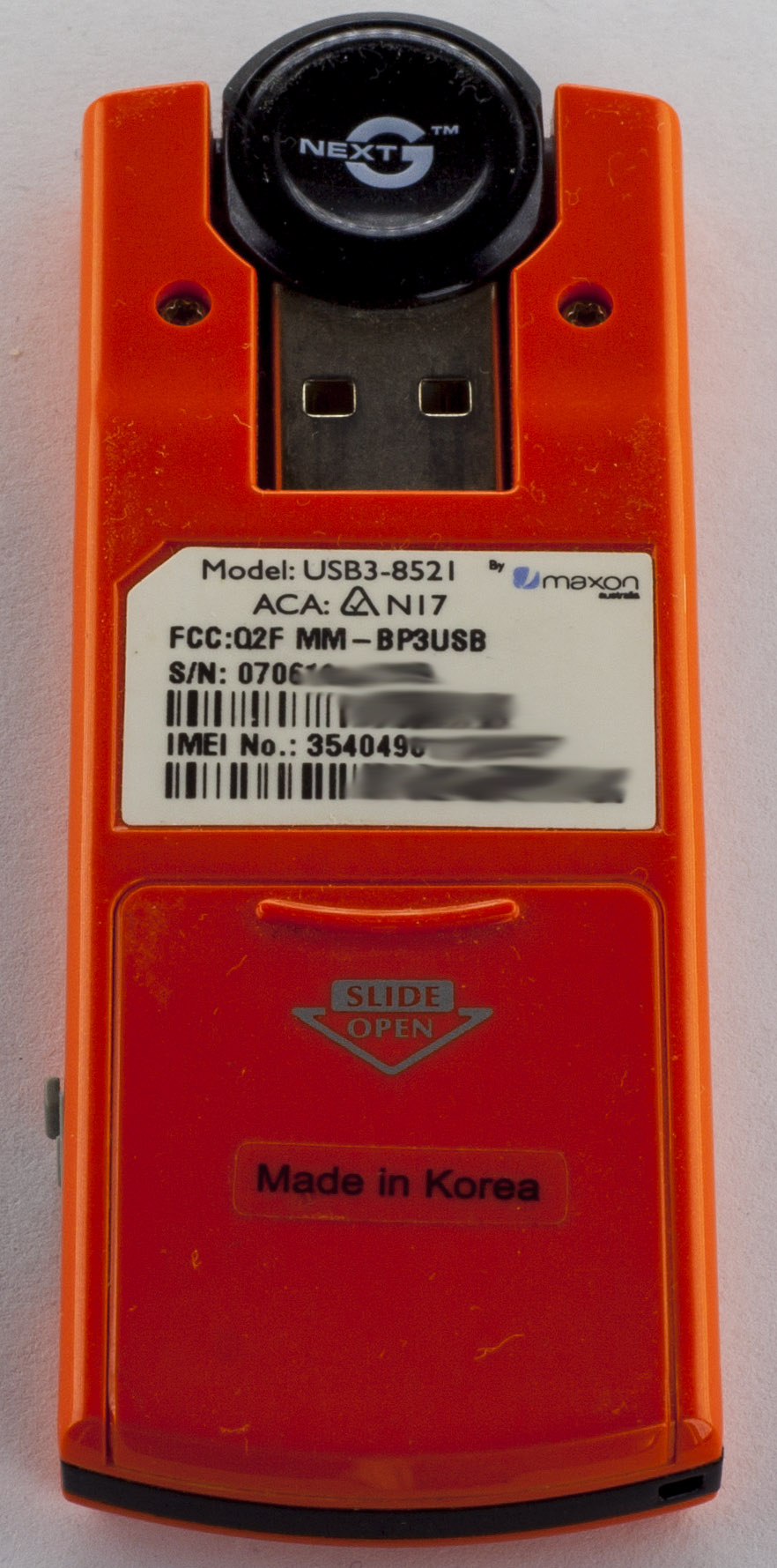 A quick one today, we’ll be looking at the Telstra NextG Turbo USB Modem (USB3-8521) which is a USB modem using the NextG network to have Internet on the go. It has a slide where the SIM card goes and you can connect an external antenna.