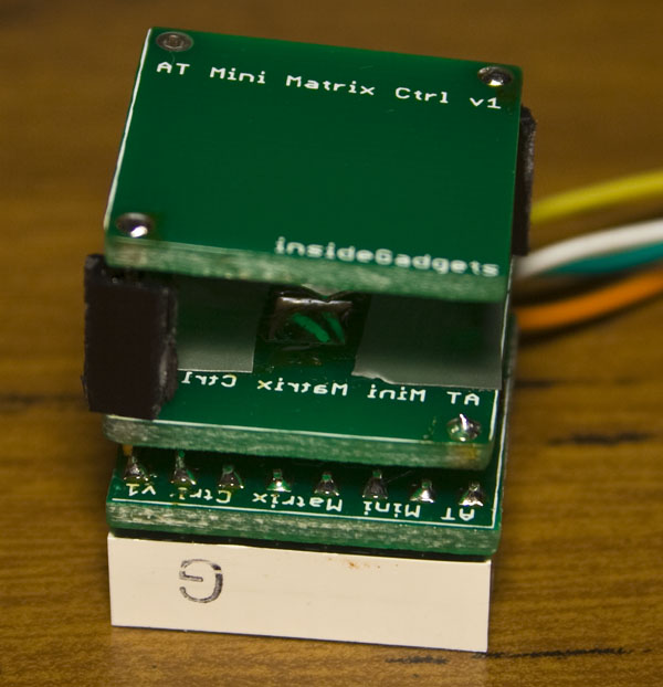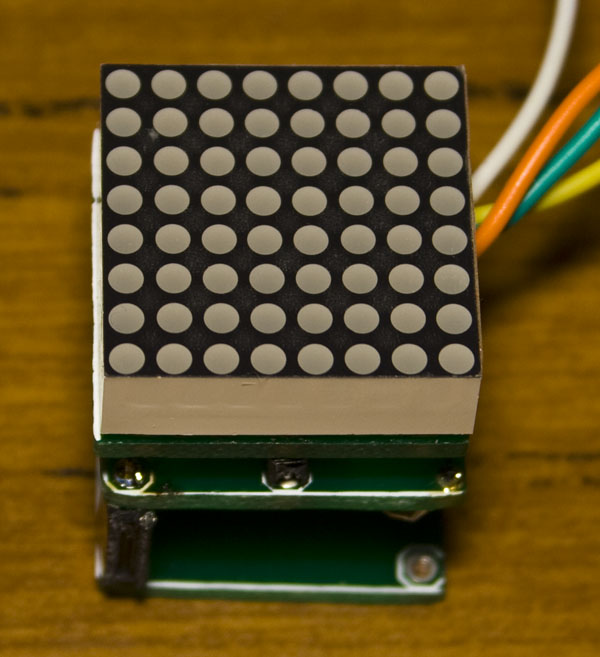 A small 20mm 8×8 LED matrix controlled by an 32pin TQFP ATmega48/88 with a 32.768KHz crystal that’s battery powered to display some animations or text on specific dates such as on new years eve or on a birthday.