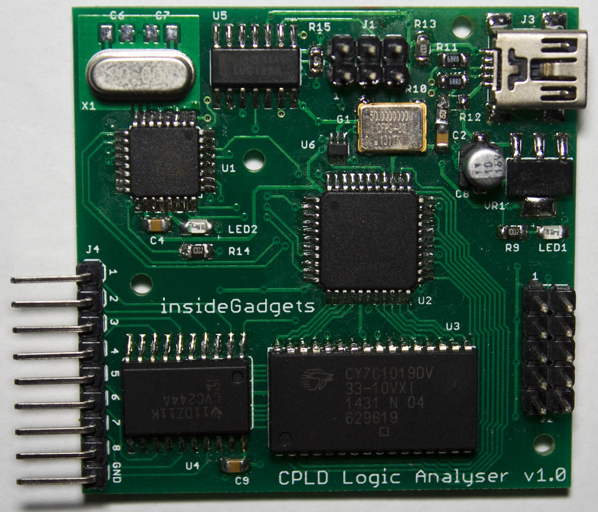 An 8 input CPLD based Logic Analyser with a selectable sample rate up to 50 MSPS with up to 131Kbit sample depth per input, controllable via USB with a GUI or command line interface and data format readable by Sigrok PulseView.